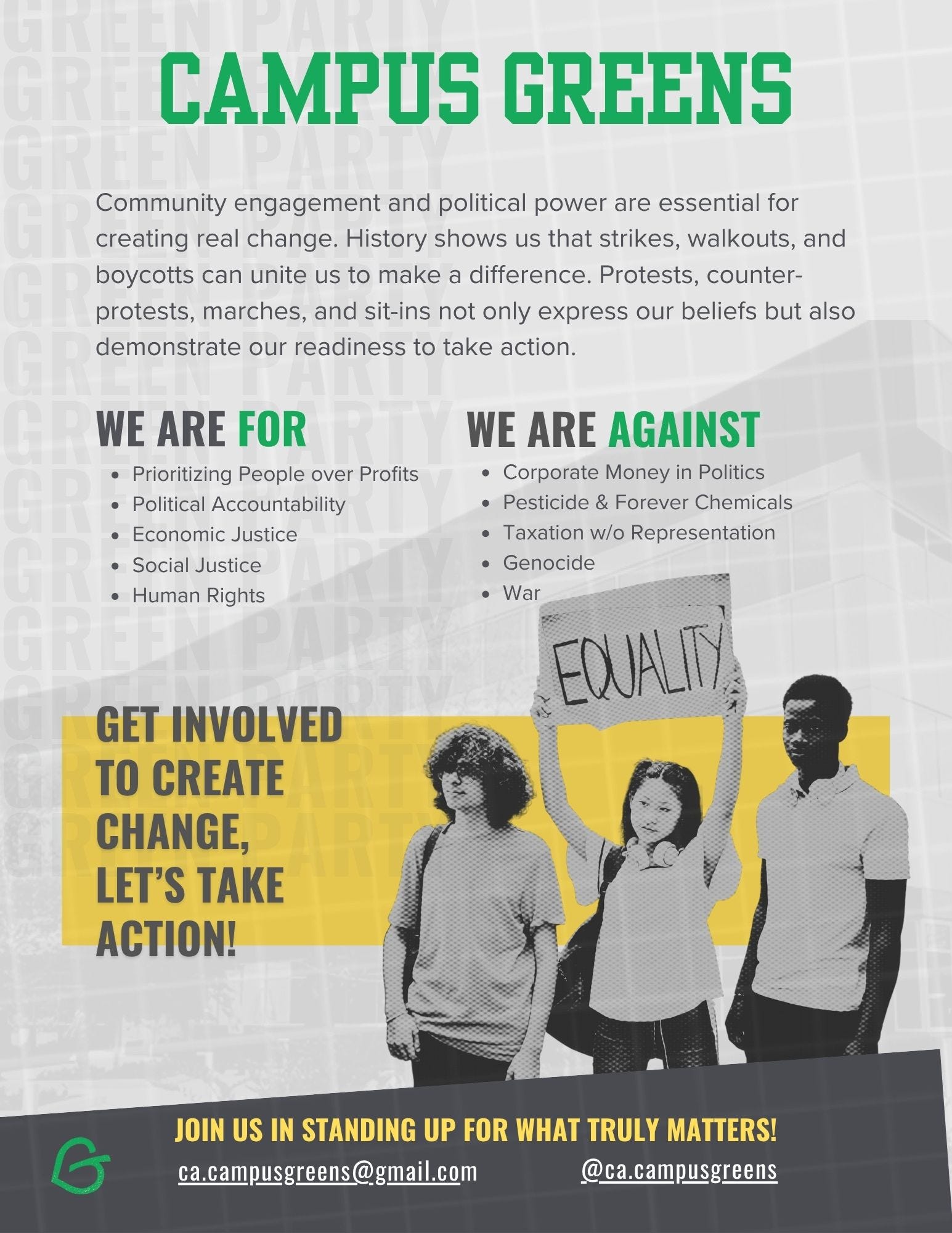 Campus GreensYou have a voice in the Campus Greens! We're an adhoc group of students, advisors and members of the Green Party supporting student empowerment. California Green PartyApr 18, 202522ShareJoin UsFollow Us